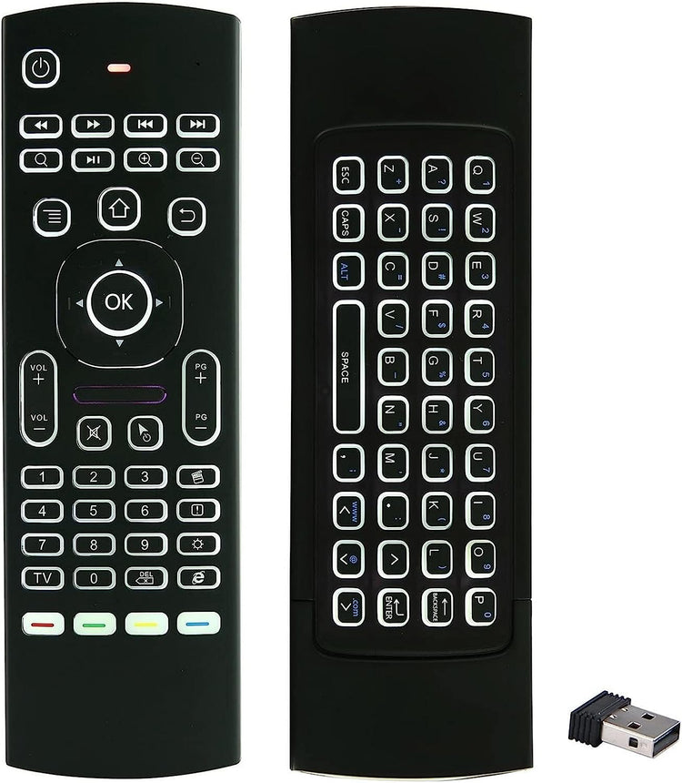 - Télécommande 3 en 1 : souris Air rétroéclairée, mini clavier QWERTY sans fil et télécommande universelle. Adoptant la technologie RF 2,4 GHz, Plug and Play. Piles non incluses. Non compatible avec Fire TV Stick.